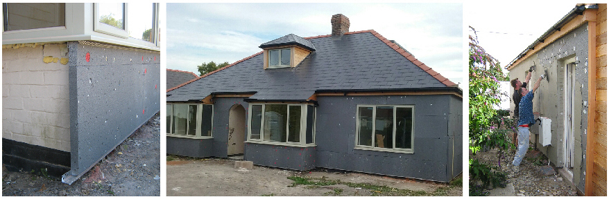 Easy and quick to install, the black foam insulation boards must have alarmed the neighbours as they turned the house a stealth plane black. My god, were Goths who wanted to remain invisible to radar moving into the village? Fortunately the final over coats of waterproof render soon returned the look of the house to normal.