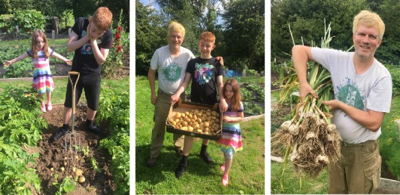 Digging for potatoes is always a popular game, and Eleanor and Harry were on hand to lift our first row of first earlies, Lady Christl, which were a new variety for us but seemed to perform fine. And the Elephant Garlic were finally harvested too.