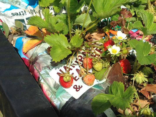 Strawberries emerging in the fruit cage in time for Wimbledon.