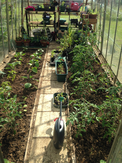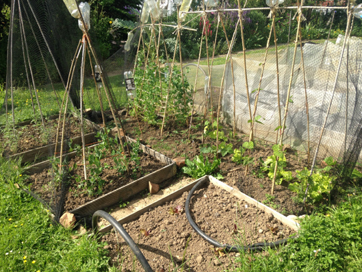 The seedlings came out of the greenhouse and cold frames to be planted out in the veg beds, allowing the tomatoes and aubergines etc to colonise the greenhouse. The potatoes were earthed up and the fruit cage started to show promise.