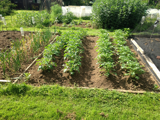 Potatoes earthed up. First earlies (right) and main crop Pink Firs (left).