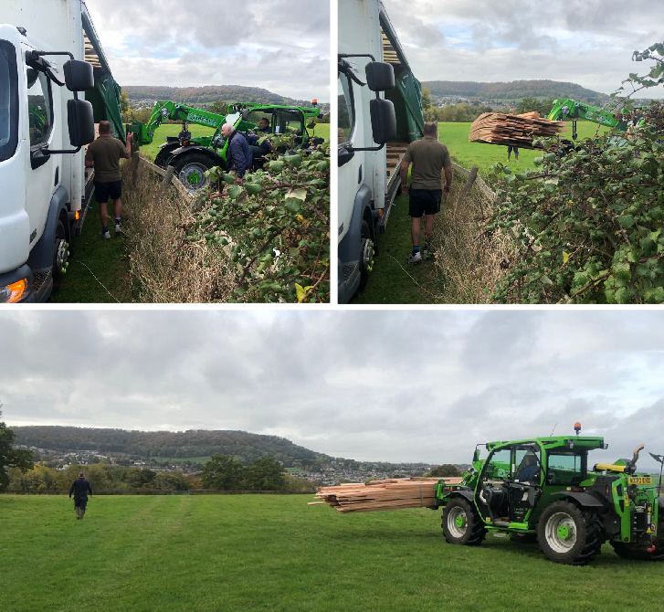 So that when the cladding duly arrived, our friendly farmer neighbours were able to lend us a mechanical hand to get it off the lorry and delivered through the paddock to the orchard.
