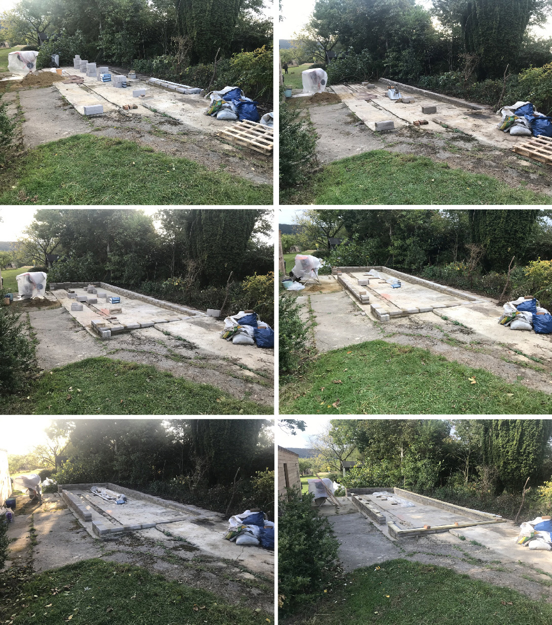 With materials on site, work could start on the foundation, or more correctly in our case, the second foundation. Like the pig sties, we decided to work with the old un-level concrete base on slopping ground, so that we don’t have to pour lots of new concrete.
