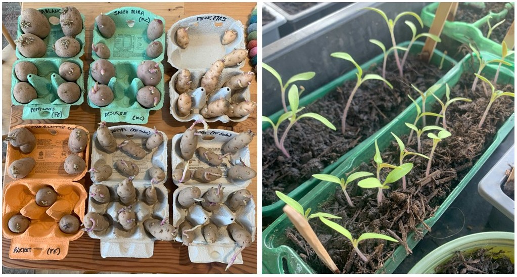 Whatever the vagaries of the weather to come, the official arrival of spring must mean that it is time for the traditional photo of our chitting potatoes and sprouting seedlings.